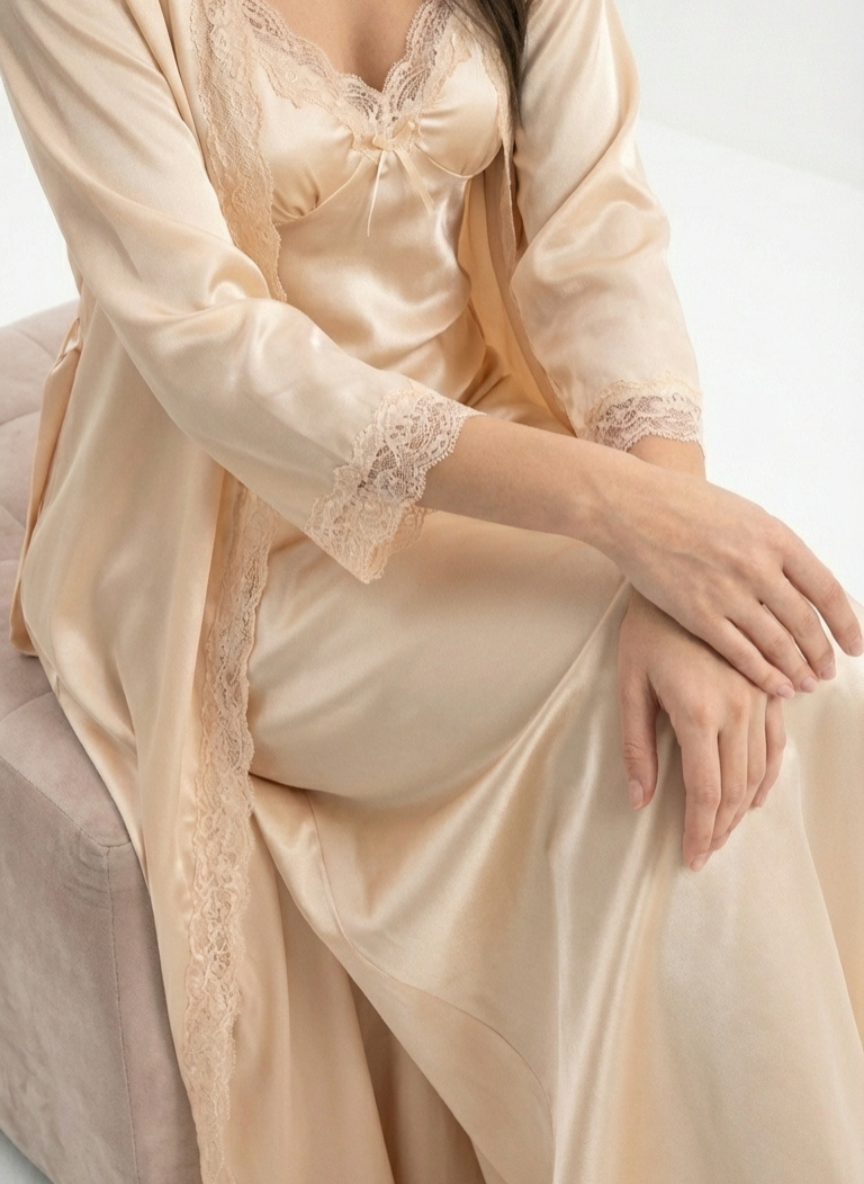 The lace trim adds an elegant, feminine touch to the nightdress and robe. It’s subtle yet striking, giving the set a premium feel without overdoing it. A design that’s both sexy and sophisticated.