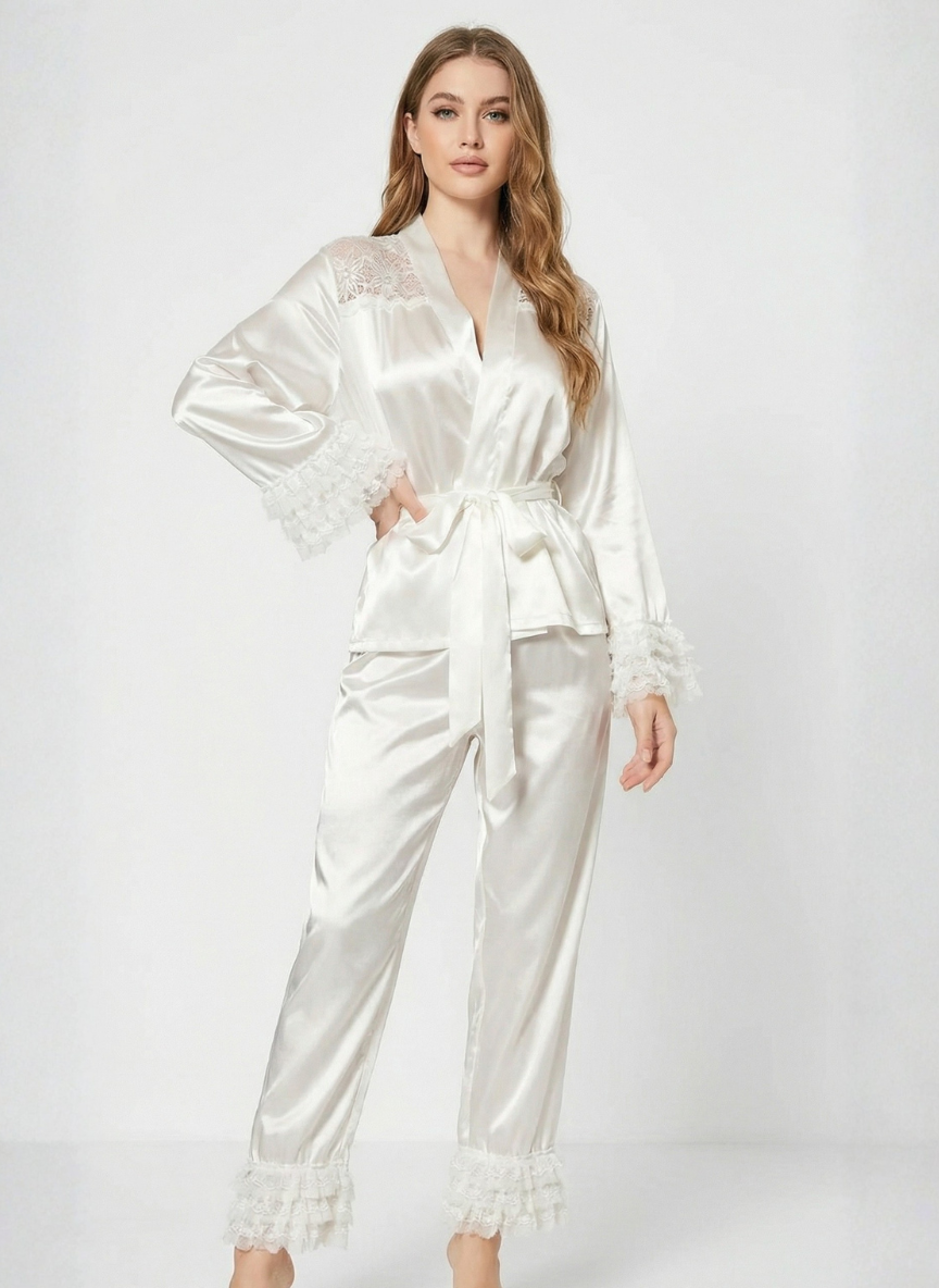 Wrap yourself in silky comfort with this elegant bridal pajama set. Designed with a soft ice-silk fabric, it glides smoothly on the skin and keeps you cool from morning prep to late-night unwind. The luxurious shine makes every moment feel a little more special.