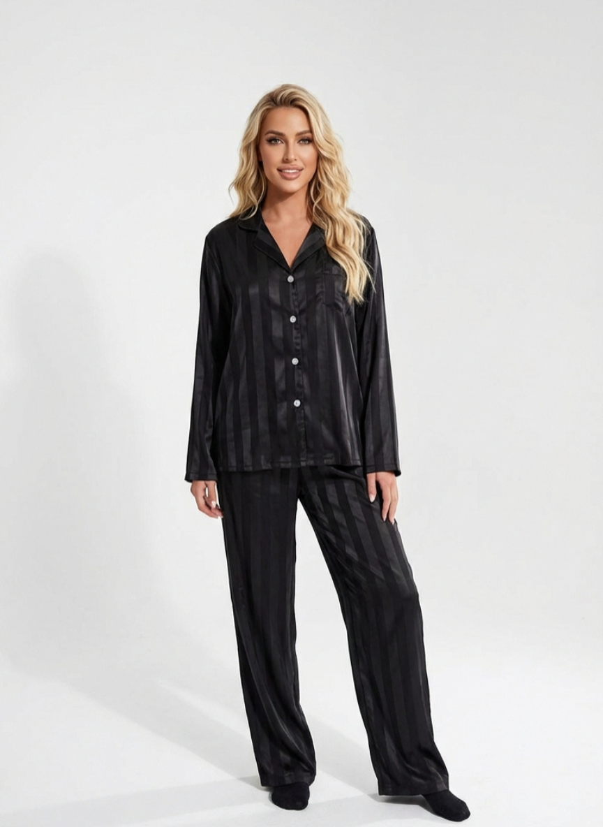 The loose long-sleeve top offers breathable comfort with a tailored touch. Matching trousers fall gently for easy movement and all-night ease. Perfect balance between structure and softness.