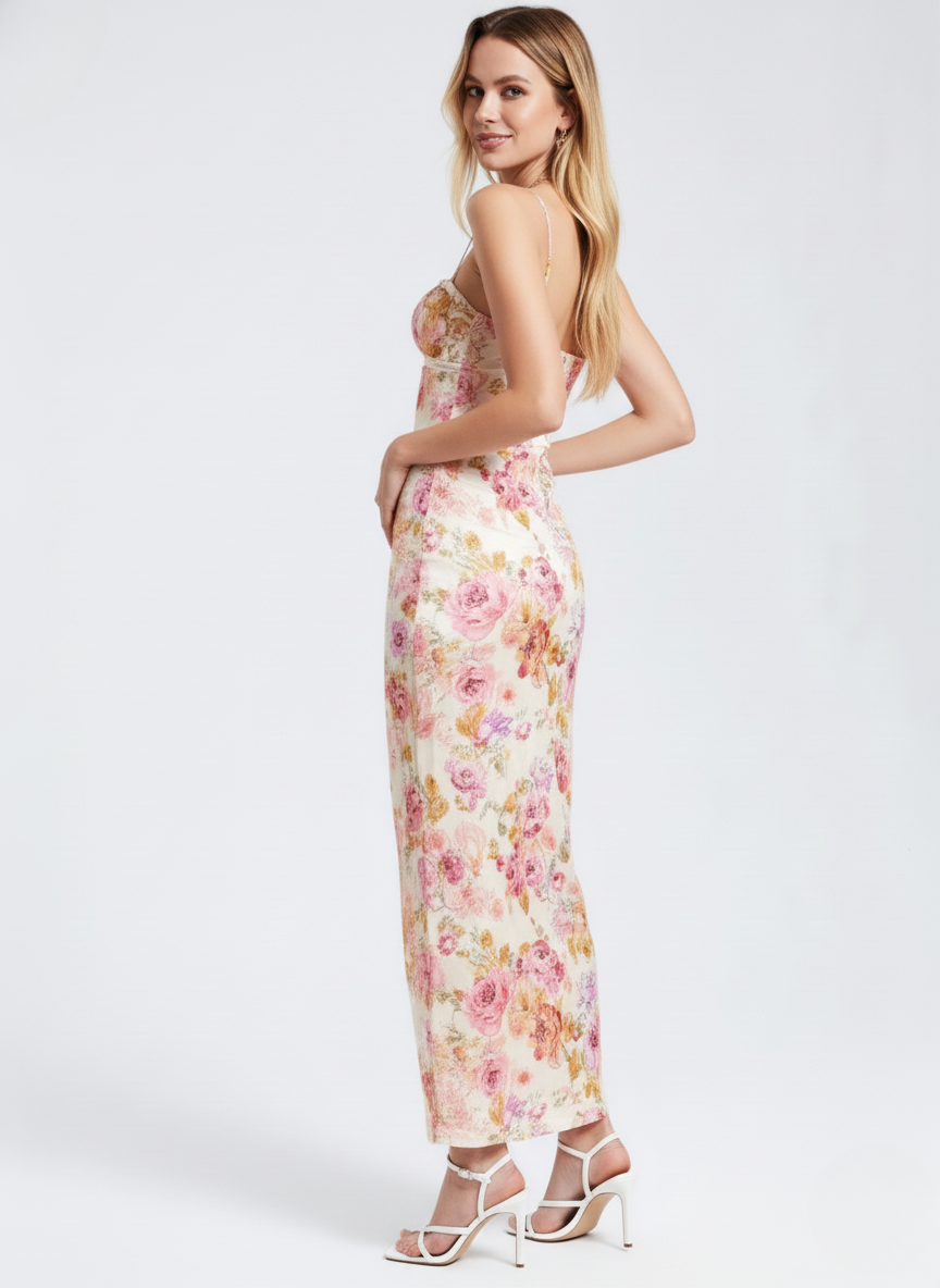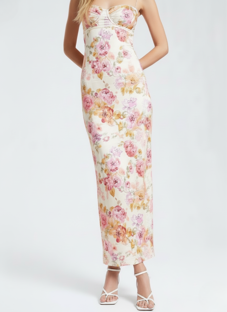 Soft floral prints create a fresh and elegant presence. The design feels light yet refined, perfect for warm-weather styling. Every detail brings a graceful, feminine charm.